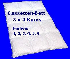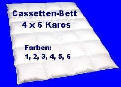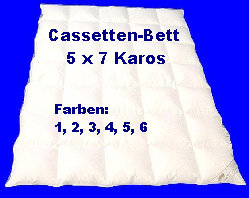 Die Konstruktion des Cassetten-Bettes ist so angelegt, dass keine Kältebrücken entstehen können. Dafür sorgt ein aufwendig eingearbeiteter Zwischensteg, der, je nach Wärmerückhaltung, unterschiedlich hoch ausgewählt werden kann. Je höher der Steg, desto höher das Wärmerückhaltevermögen. Die klassische Cassetten-Decke hat eine Aufteilung von 3 x 4 Karos. Exclusivere Cassetten-Betten besitzen 4 x 6 , 5 x 7 oder 6 x 8 Karos. In Verbindung mit einer hochwertigen Daunenfüllung und hochwertigen Inlett-Stoffen erhält der Kunde ein Deckbett, das höchsten Schlafkomfort garantiert. Die Decken können nur mit einem speziellen Füllrohr gefertigt werden. Dabei wird für jedes Karo die Füllung einzeln abgewogen. Ein Verrutschen der Füllung ist, bedingt durch die Konstruktion nahezu unmöglich. Die äußeren Kanten hochwertiger Decken werden durch eine Biese vor Verschleiß geschützt. Mit Erscheinen der Preisliste 2008 haben wir das Sortiment im hochwertigen Bereich erheblich erweitert. Hierbei verfüllen wir die hochwertigsten Dithmarscher Daunen und Federn.