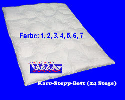 Karo-Stepp-Betten oder 24-Stege-Betten sind durch die in der Bezeichnung angegebene Anzahl Stege aufgeteilt. Während diese Konstruktion sehr reinigungsfreundlich ist, verhindern die Stege jedoch nicht das Verrutschen der Füllung in vollem Maße. Ein Verteilen des Materials ist mit ein paar gekonnten Handgriffen und täglichem Aufschütteln mühelos möglich.