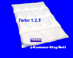 Kammer-Steg-Betten sind in 100er Qualitätseinschütte und feiner Mako-Einschütte in den Größen 135x200 cm, 155x200 cm und 155x220 cm lieferbar. Während die Standardgröße in mehreren Farben zur Verfügung steht, sind die Komfortgrößen meist nur in Farbe 1 und/oder 2 zu haben. Dazu können Sie uns gern kontaktieren.